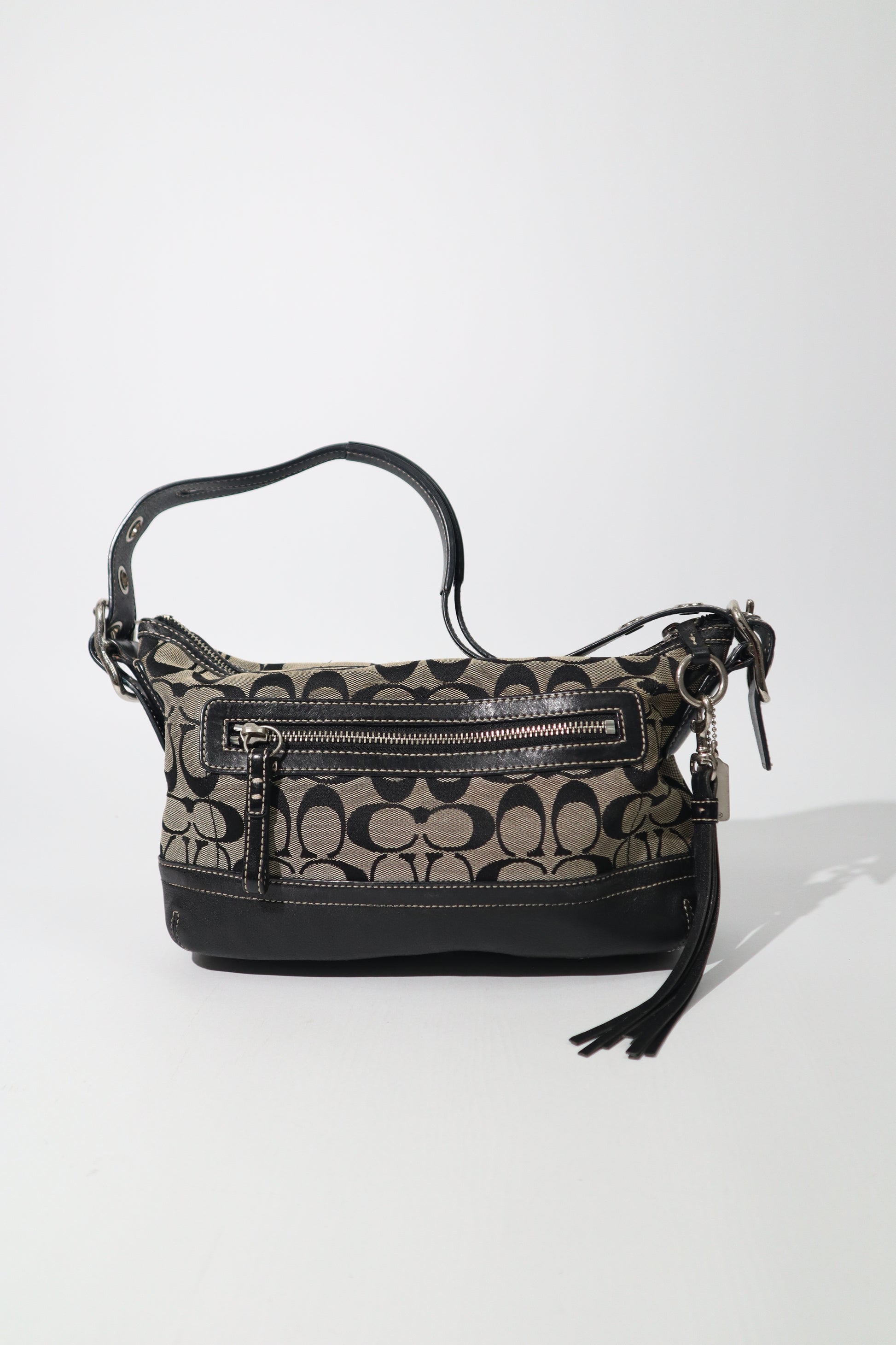 The Coach Y2K East West Demi Shoulder Bag is a sleek and timeless silhouette from Coach’s early 2000s era, designed with the brand’s iconic signature black and grey “C” monogram canvas and finished with natural vachetta leather trim. This East West demi shape is a true Y2K classic, offering a streamlined profile that sits comfortably on the shoulder while remaining effortlessly stylish.