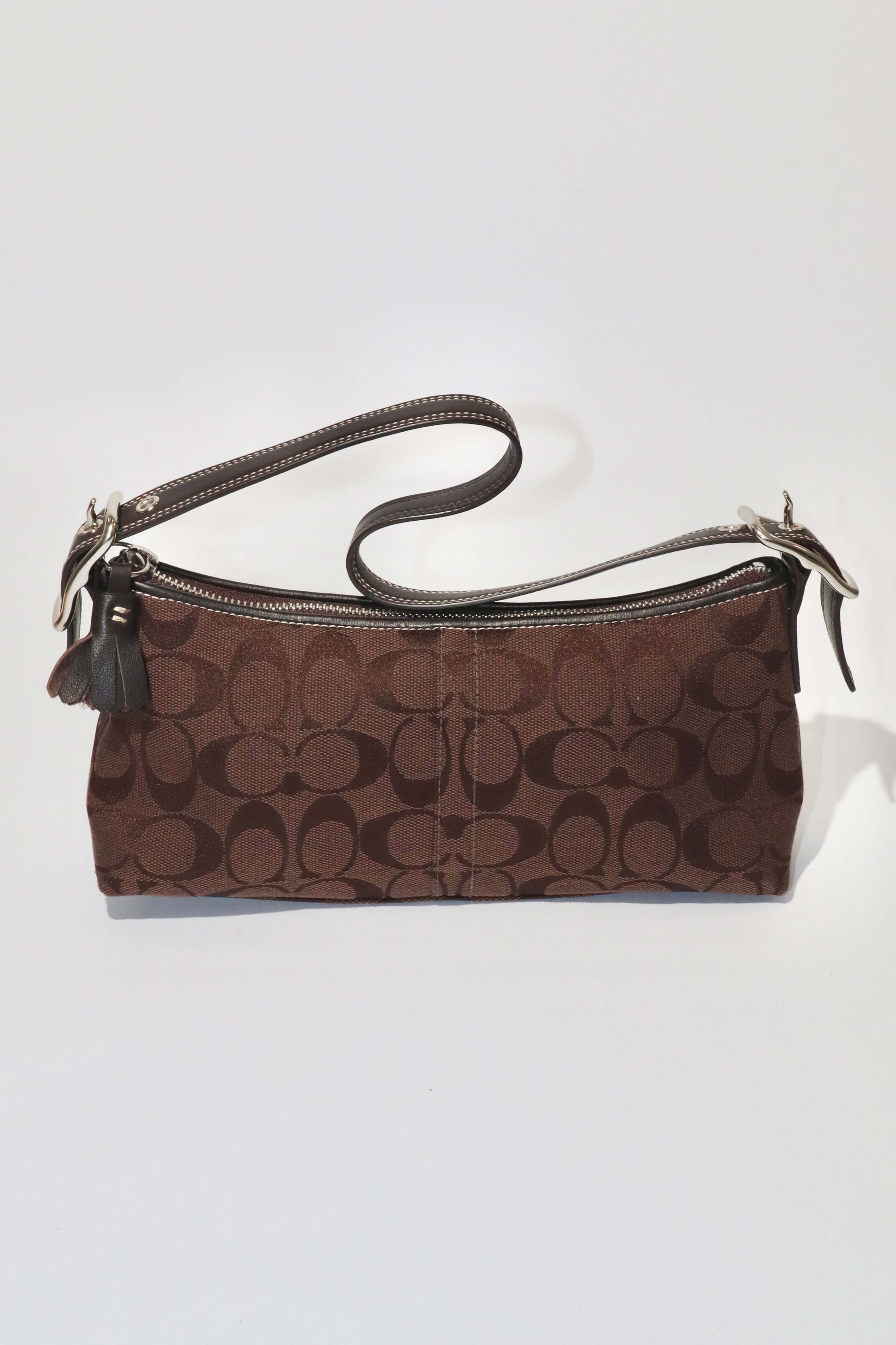 The Vintage Coach Chocolate Brown Baguette Demi Shoulder Bag is a rare and elegant piece from Coach’s early 2000s archive. Crafted from signature ‘C’ monogram canvas with chocolate brown leather trim, this compact demi silhouette offers a refined yet playful Y2K look. Its rich brown colourway is considered rare for this style, making it a desirable find for vintage collectors and Coach enthusiasts.